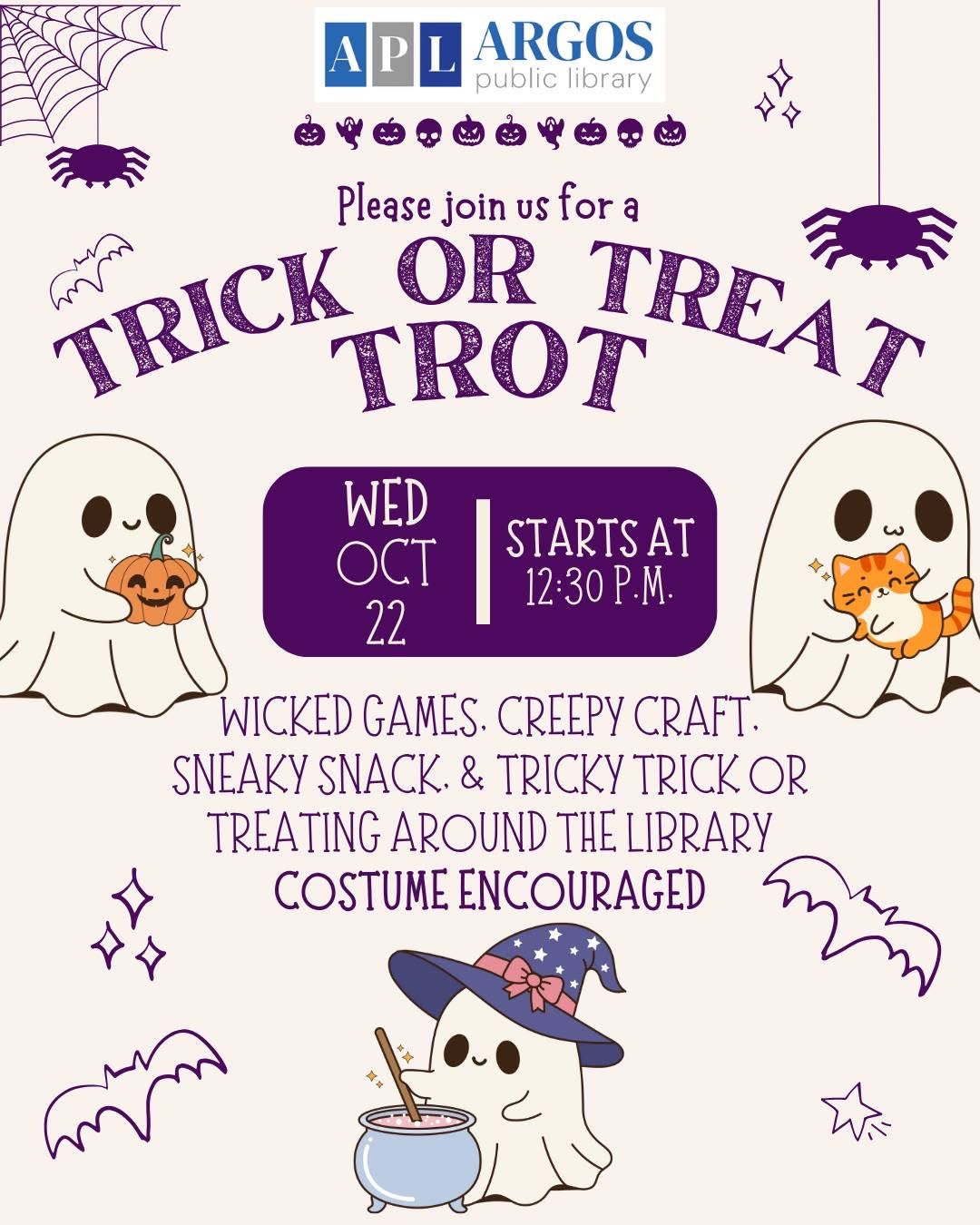 Join us for a Trick or Treat Trot through the library for at home kiddos on Wednesday, October 22nd at 11:30am. Costumes are greatly encouraged! |