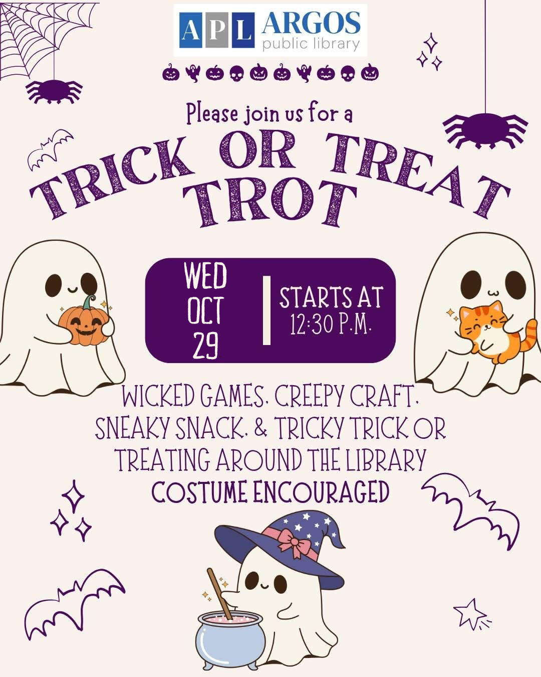 Join us for our make up date for Trick or Treat Trot through the library for at home kiddos on Wednesday, October 29th at 12:30pm. Costumes are greatly encouraged! |