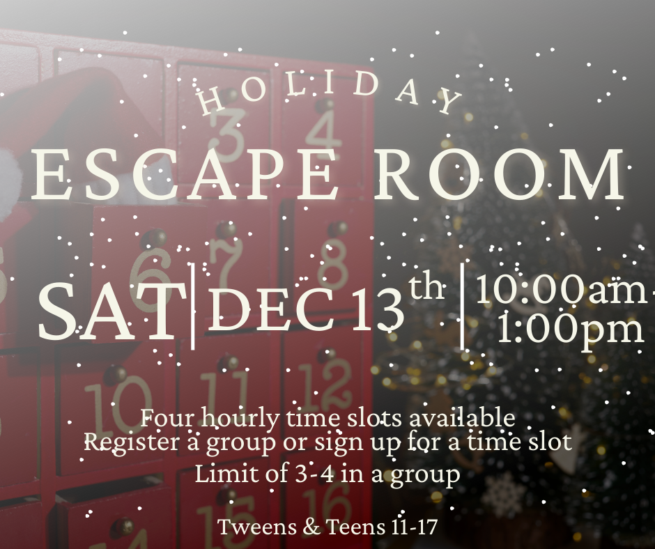 TNT is an activity time for Tweens and Teens ages 11-17. Each TNT program offers a unique experience and allows for tweens and teens to learn and create new things. This TNT, we test our problem solving abilities with a Holiday Escape Room. Four time slots are available to register for. Group limit is 3-4 […] |