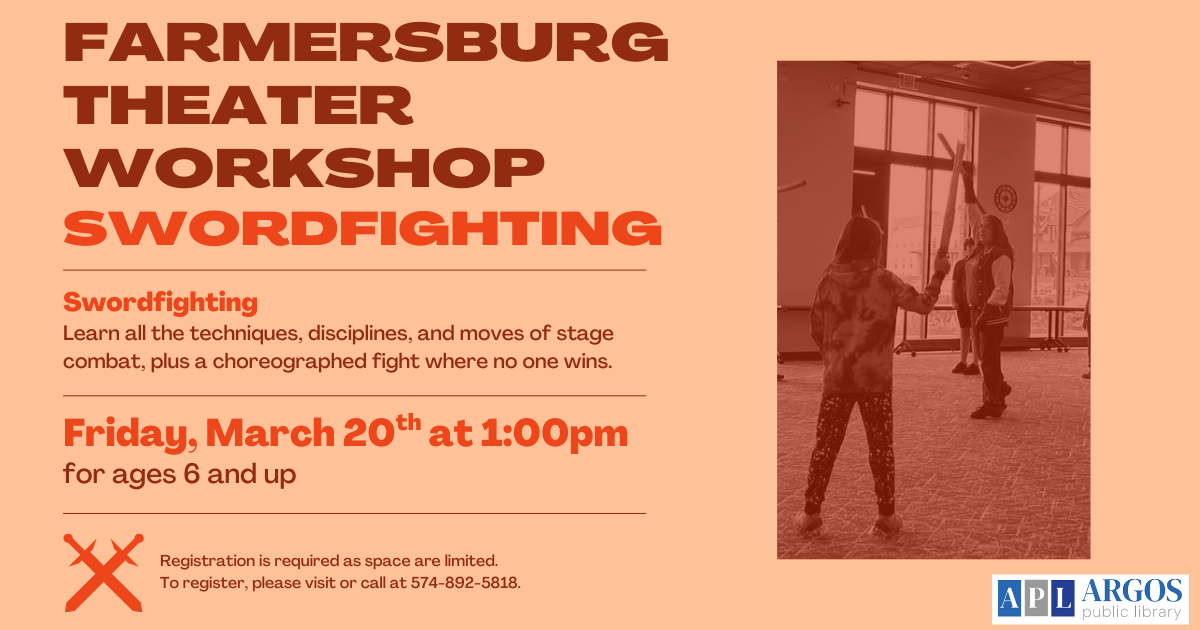 Join Farmersburg Theater for a Swordfighting Workshop at Argos Public Library on Friday, March 20th at 1:00pm. Farmersburg Theater is dedicated to the creation of professional theater through performance and […]