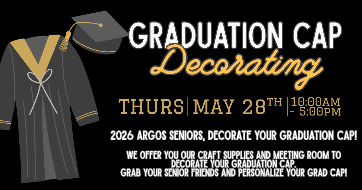 2026 argos Seniors, decorate your graduation cap! We offer you our craft supplies and meeting space to decorate your graduation cap. Grab your senior friends and personalize your grad cap!